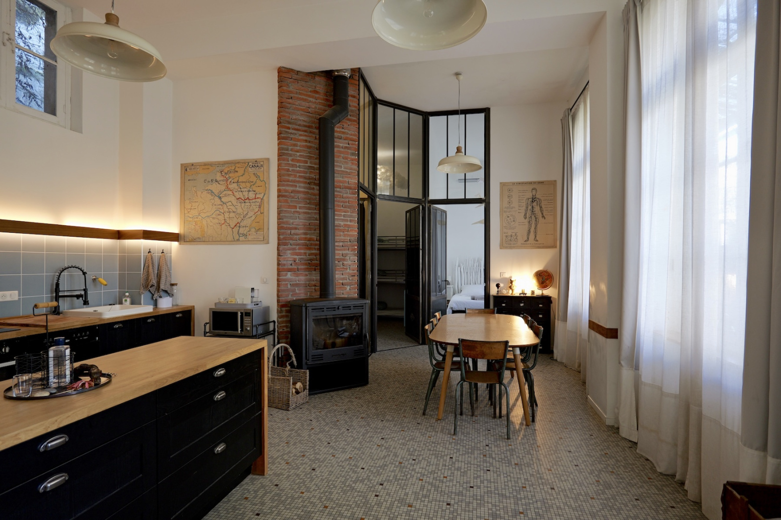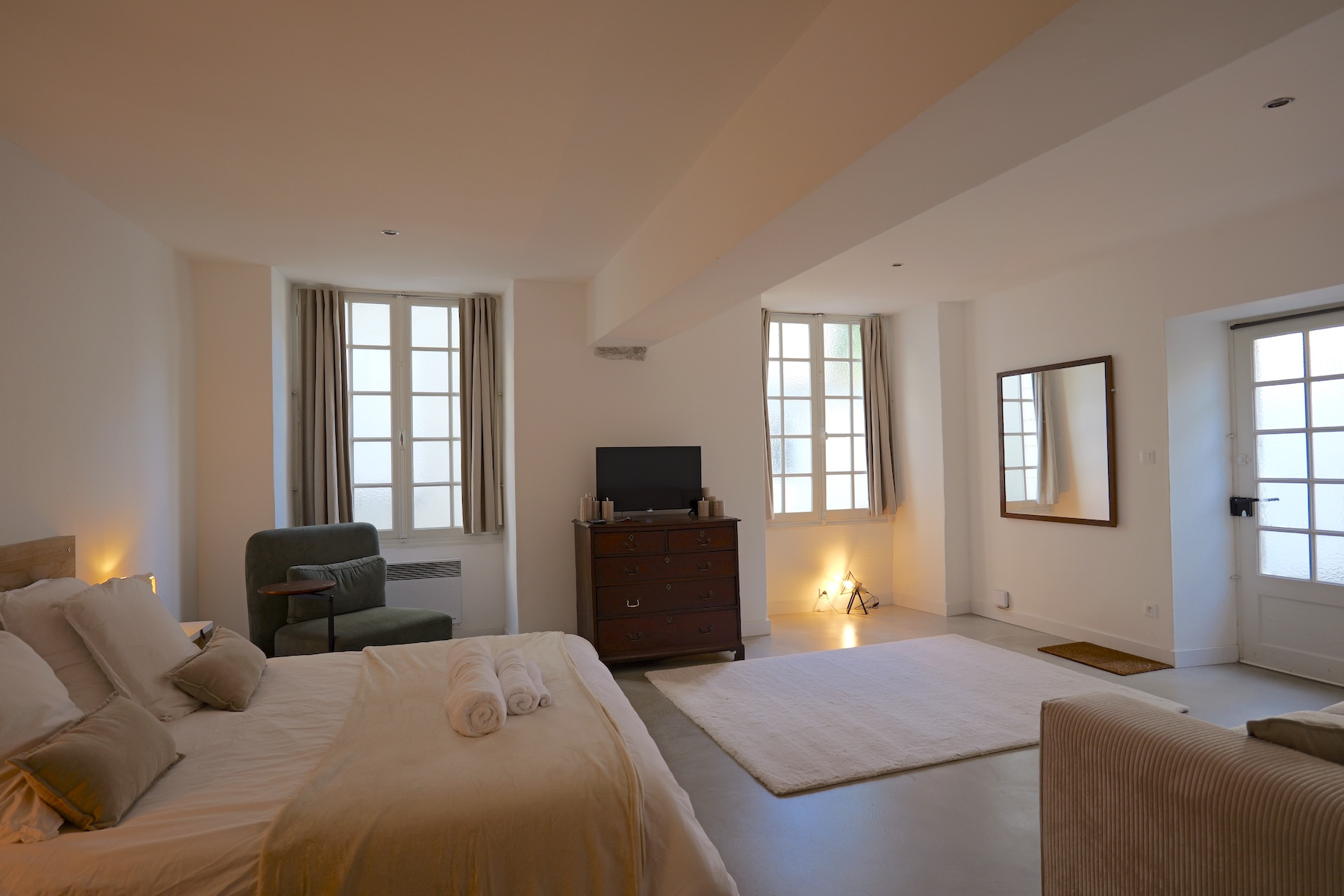 Appartement entièrement réaménagé d'environ 60 m2 composé d'une entrée, un séjour-chambre, une jolie cuisine avec cheminée XVIe avec four à pain, salle d'eau et WC – Destiné actuellement à la location saisonnière (normes PMR), il communique par l’entrée de la maison, et est accessible indépendamment par la cour.