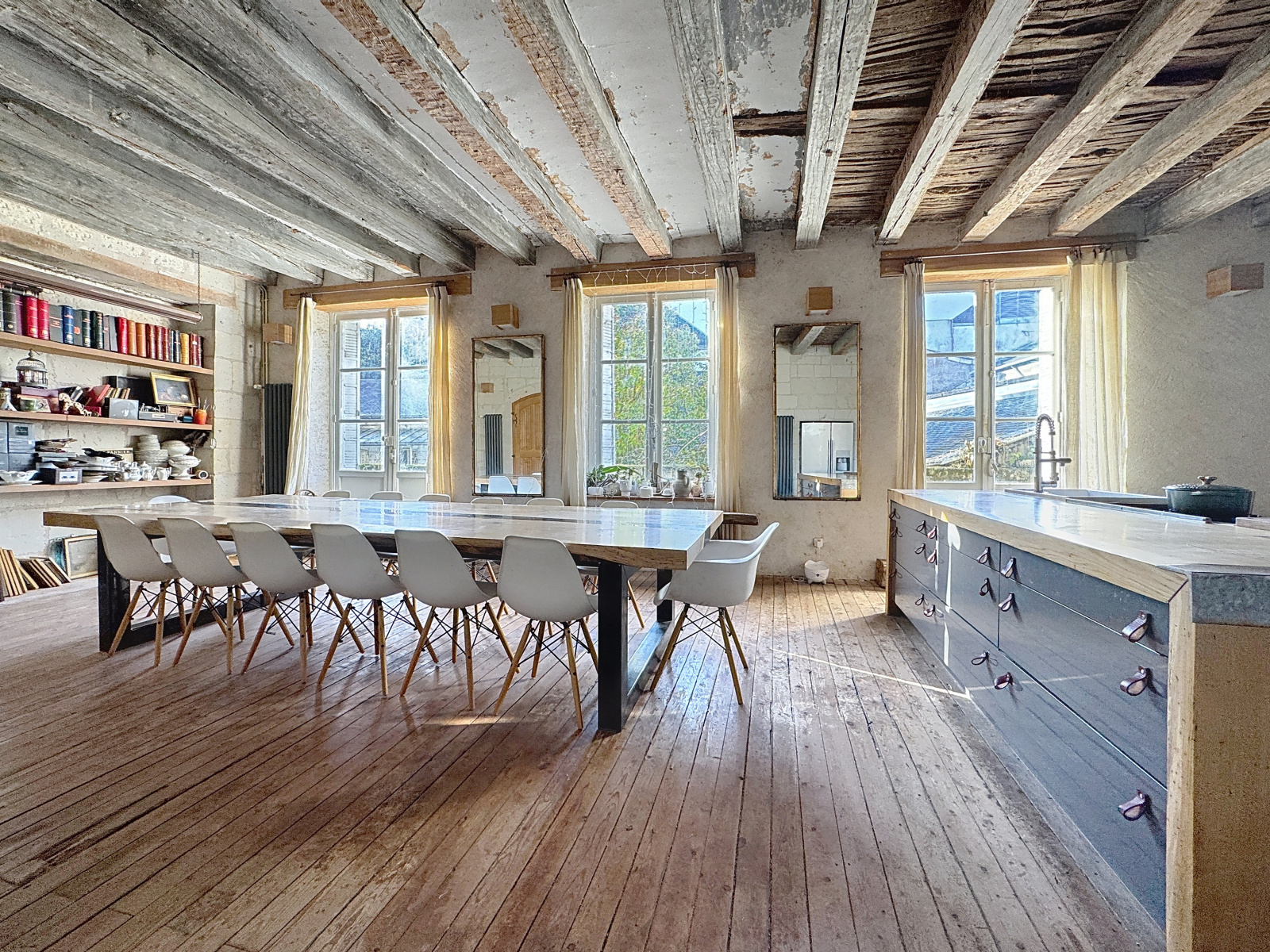 Salle à manger sur parquet de 48 m2 (9,70m x 4,90m, niches murales) et dans son prolongement la partie cuisine équipée d’un grand ilot technique formé de poutres taillées - Cette pièce est éclairée d’une fenêtre et 2 portes-fenêtres ouvrant sur une terrasse filante de 12m, côté jardin,