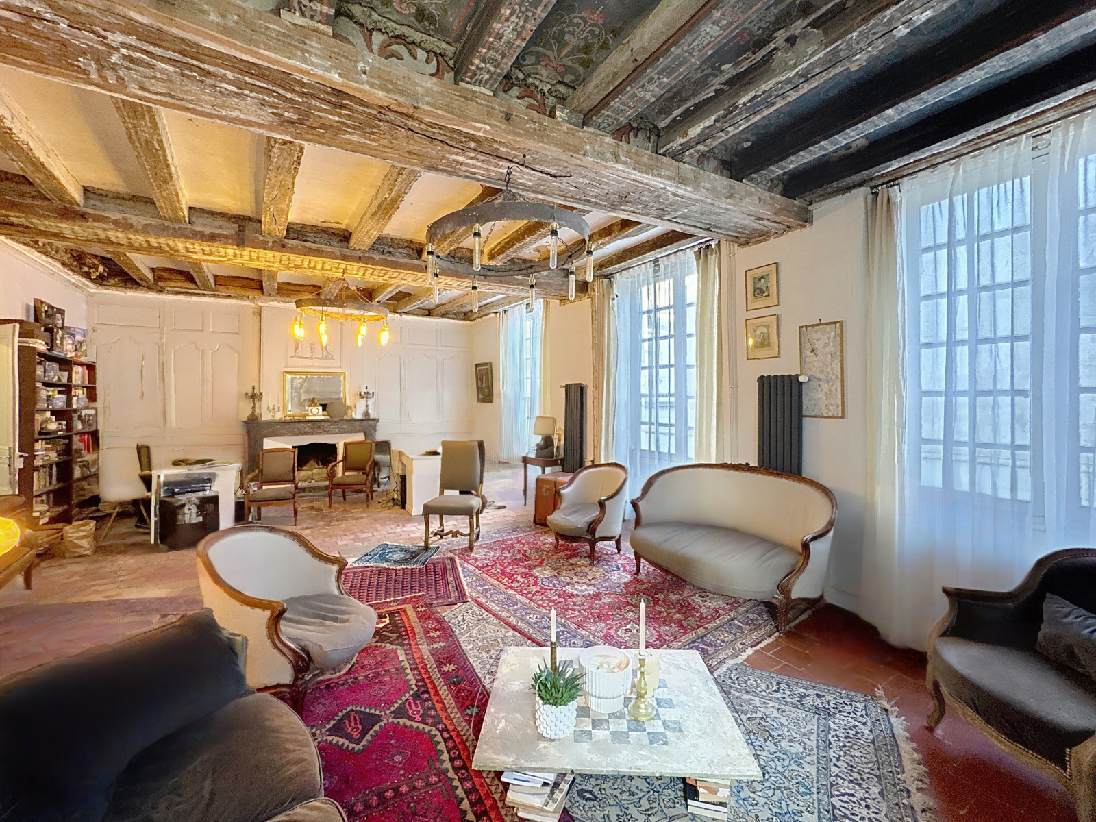 Salon de 50 m2 sur tomettes (9m de long, 3 fenêtres sur rue et une sur cour, cheminée XVIIIe avec trumeau, placards, autre cheminée XVe, poutres avec remarquables peintures polychromes datées entre 1590 et 1610)