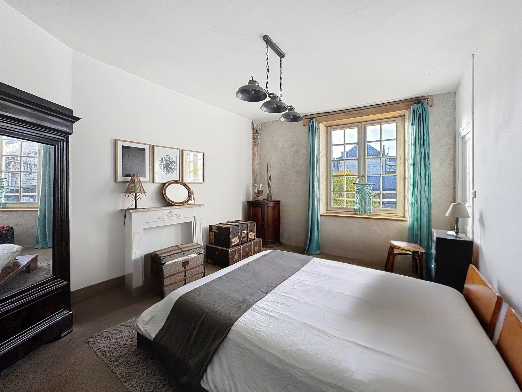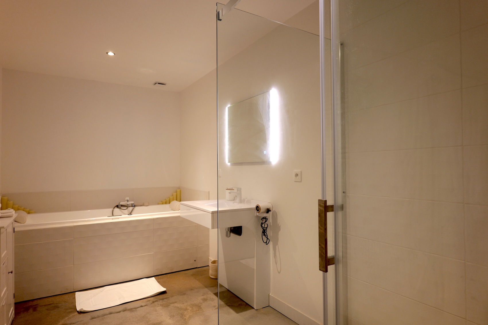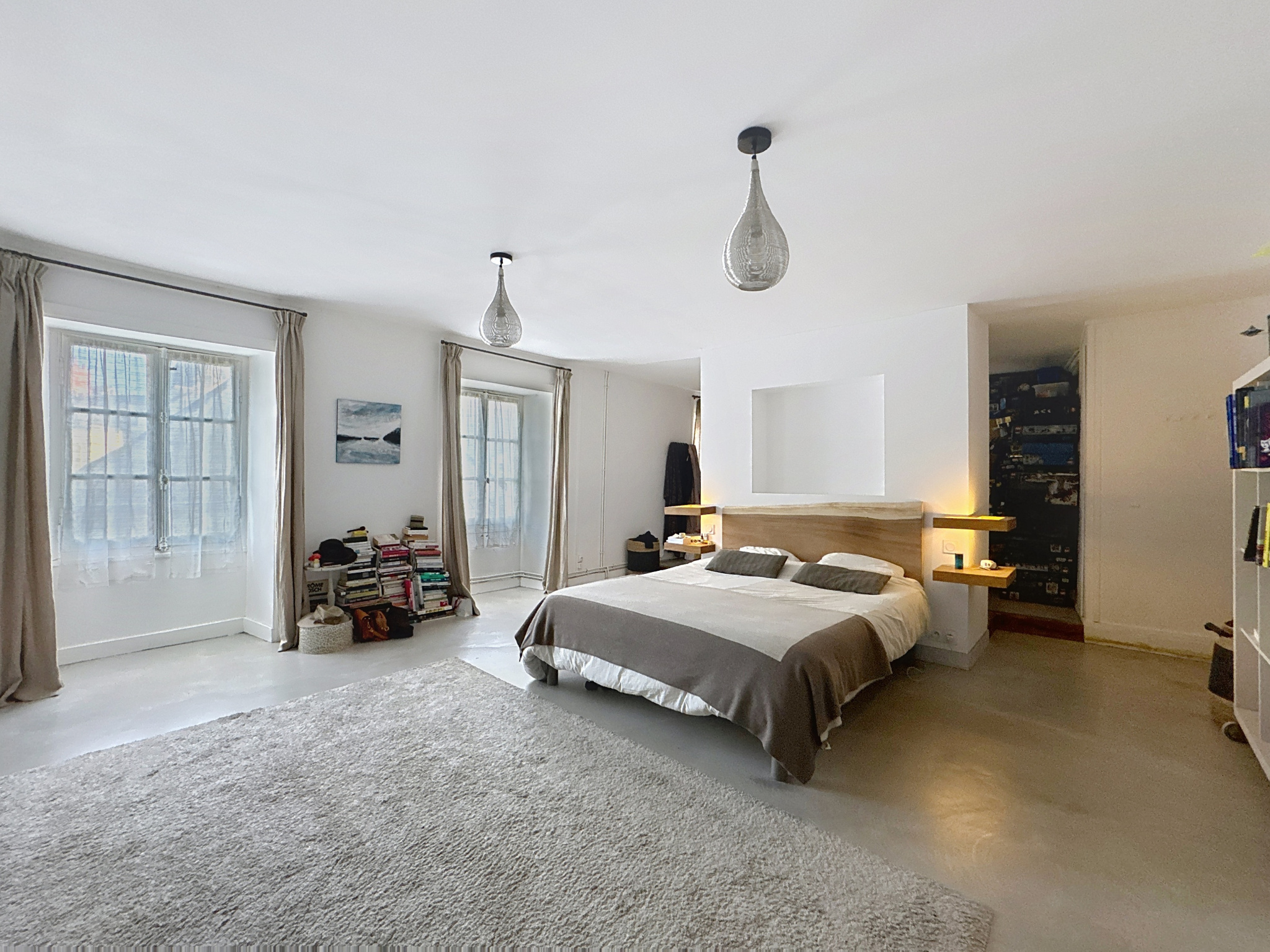 Chambre 4 (cheminée, sol en béton ciré, 3 fenêtres côté Rue) et partie salle de bains (baignoire centrale, penderie, lavabo), le tout environ 40 m2