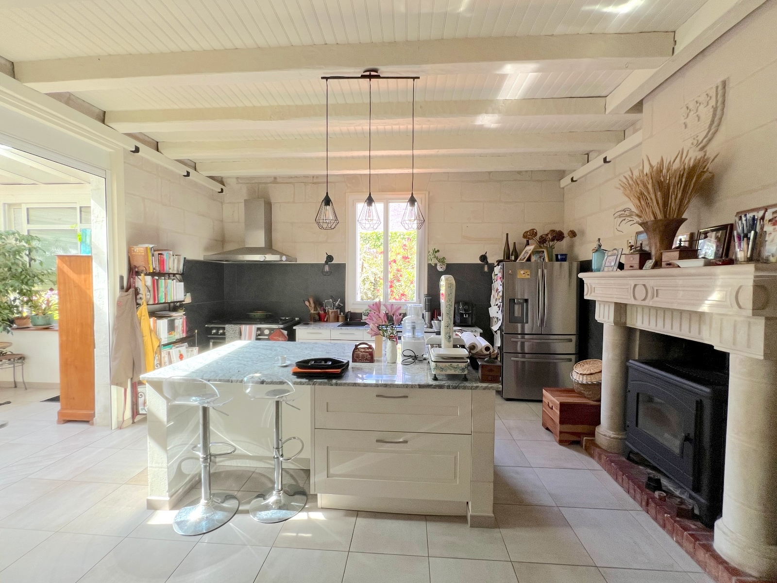 Cuisine aménagée de 26 m2 (cuisinière La Cornue, ilot central en marbre de 2,30m x 1,20m, jolie cheminée en tuffeau avec poêle en fonte à pellets) + réserve de 1,40m x 1,30m