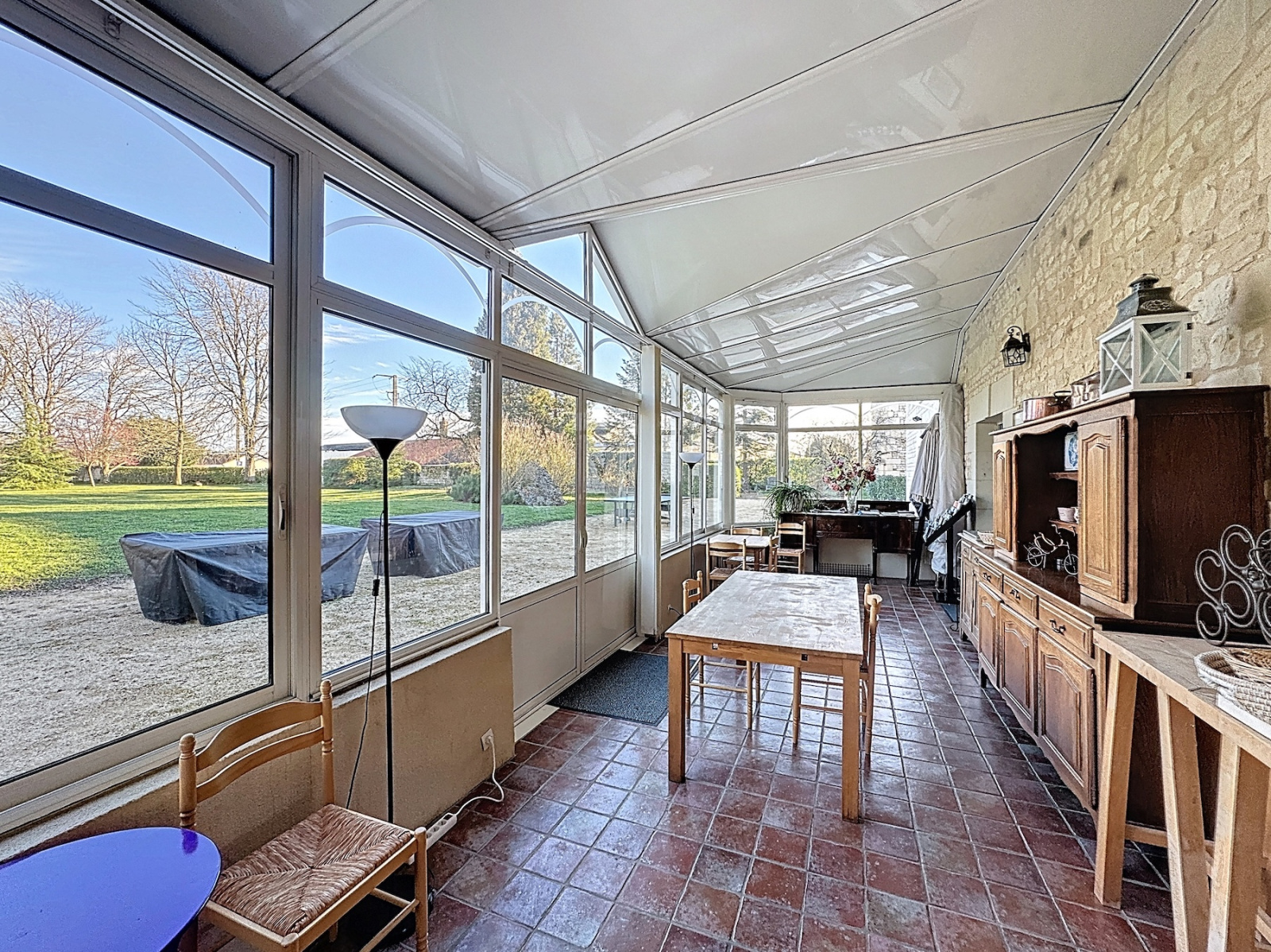 Rez-de-chaussée : Cuisine traversante de 19 m2 (poutres, cheminée avec four à pain – équipements : piano de cuisson Smeg, crédence et hotte inox, lave-vaisselle, micro-ondes, réfrigérateur/congélateur), Salon 22 m2 (murs en pierres), Véranda 27 m2 ouverte côté Parc (9,30m x 3m, 3,40m de hauteur), Chambre 6 de 14 m2, salle d’eau (douche, lavabo, WC), débarras (tableau électrique et ballon eau chaude)