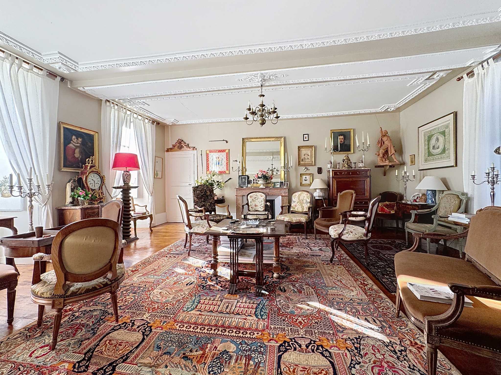 Salon traversant 37 m2 (6,30m x 5,70m, plafond à frises, parquet, cheminée)