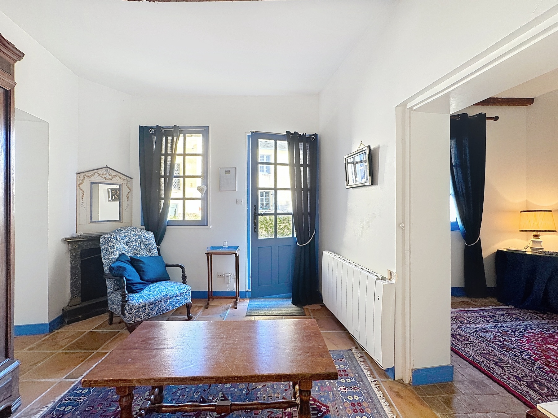 Entrée traversante 21 m2 (4,80m x 5,30m, cheminée avec poêle à bois, placards, tomettes, accès salle voutée), et escalier n°1