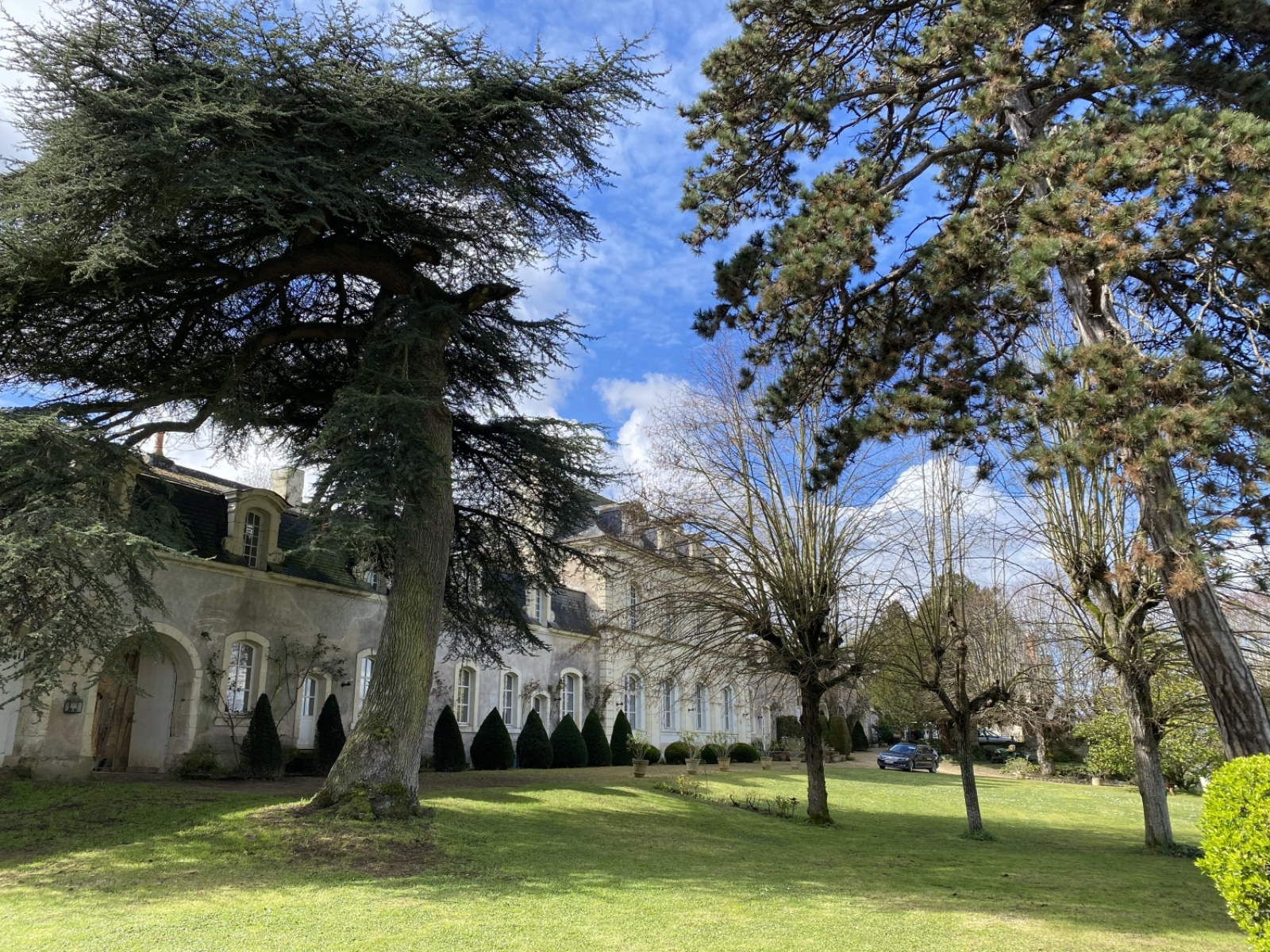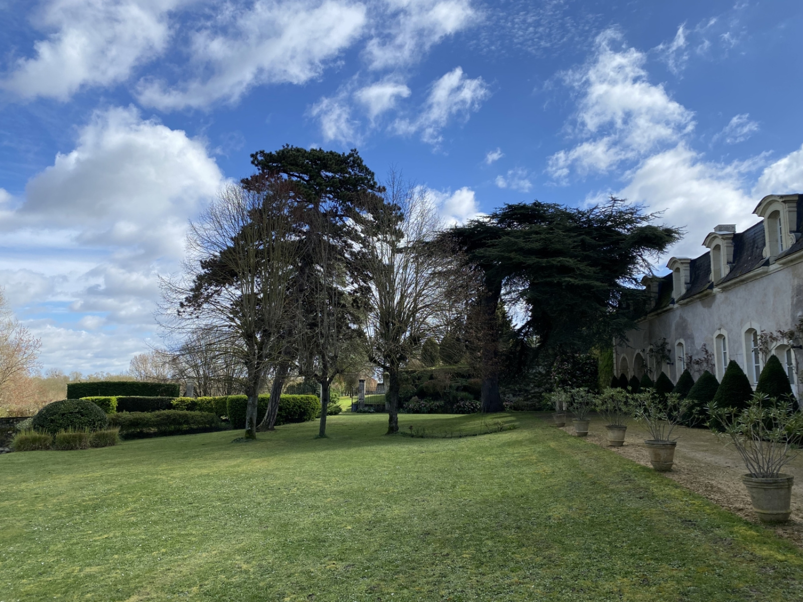 Le parc est planté d'arbres majestueux autour la propriété et remonte vers l’arrière, avec une piscine ancienne.