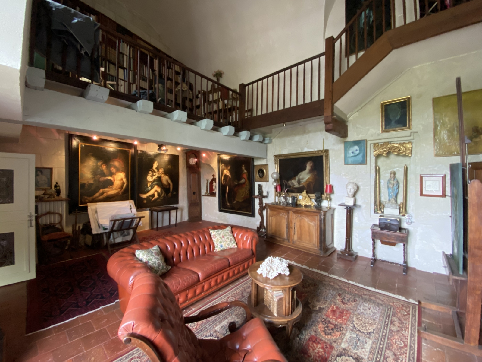 Au deuxième étage, un salon de 38 m2 avec magnifique cheminée XVe et une mezzanine à usage de bibliothèque, cuisine 17 m2 avec petite buanderie dans l'échauguette,
