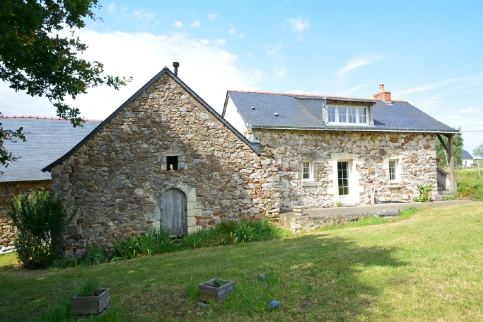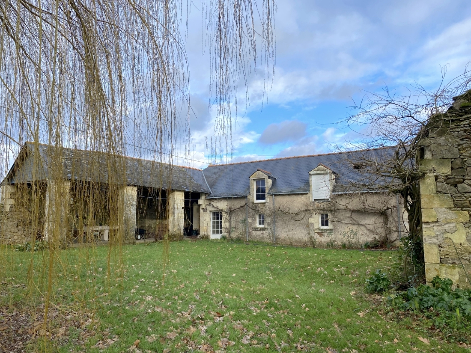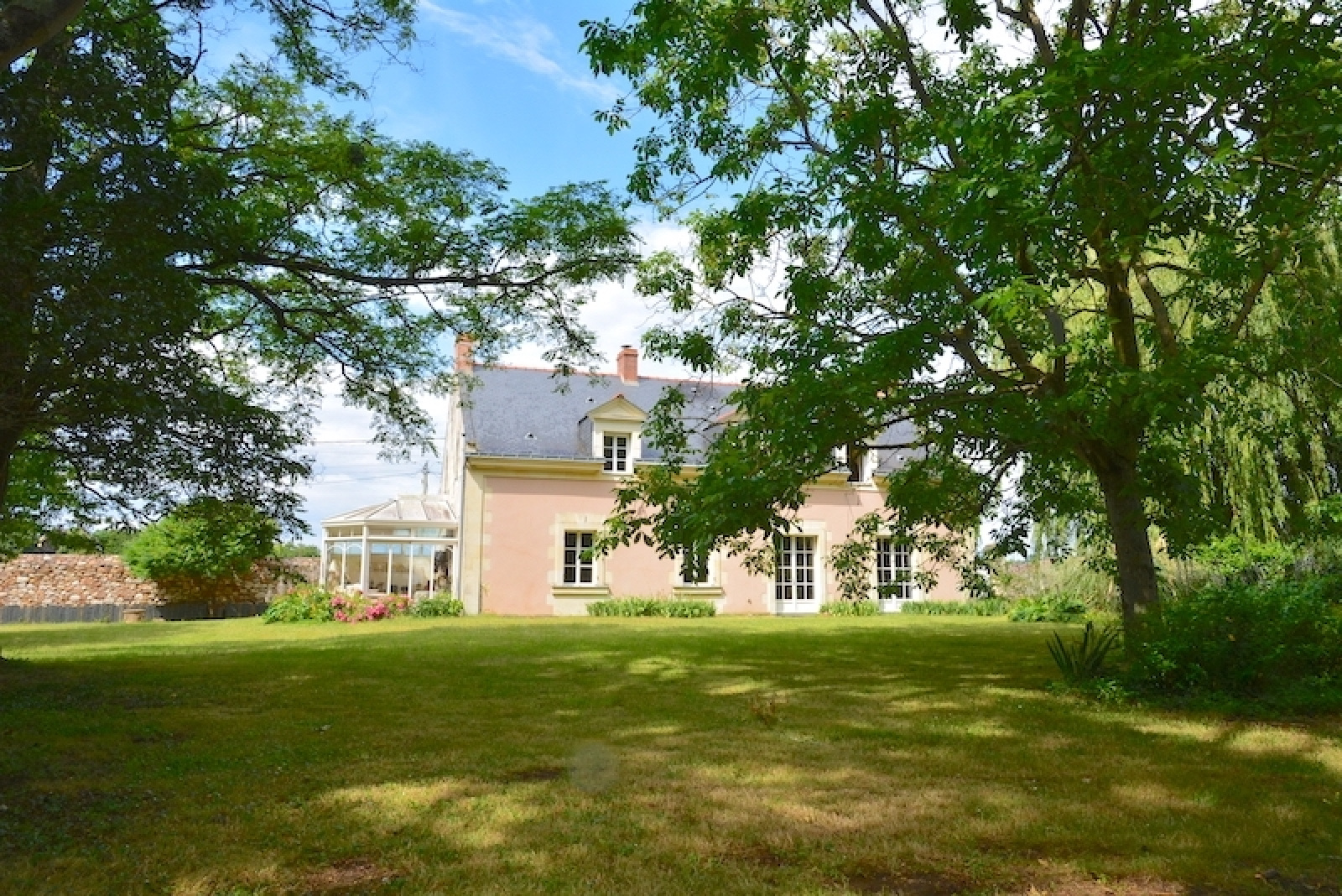 Double longère restaurée au sud d'Angers près de Brissac comprenant une maison annexe sur 3300 m2 planté de beaux arbres (chênes, frênes) avec un petite pièce d'eau.
