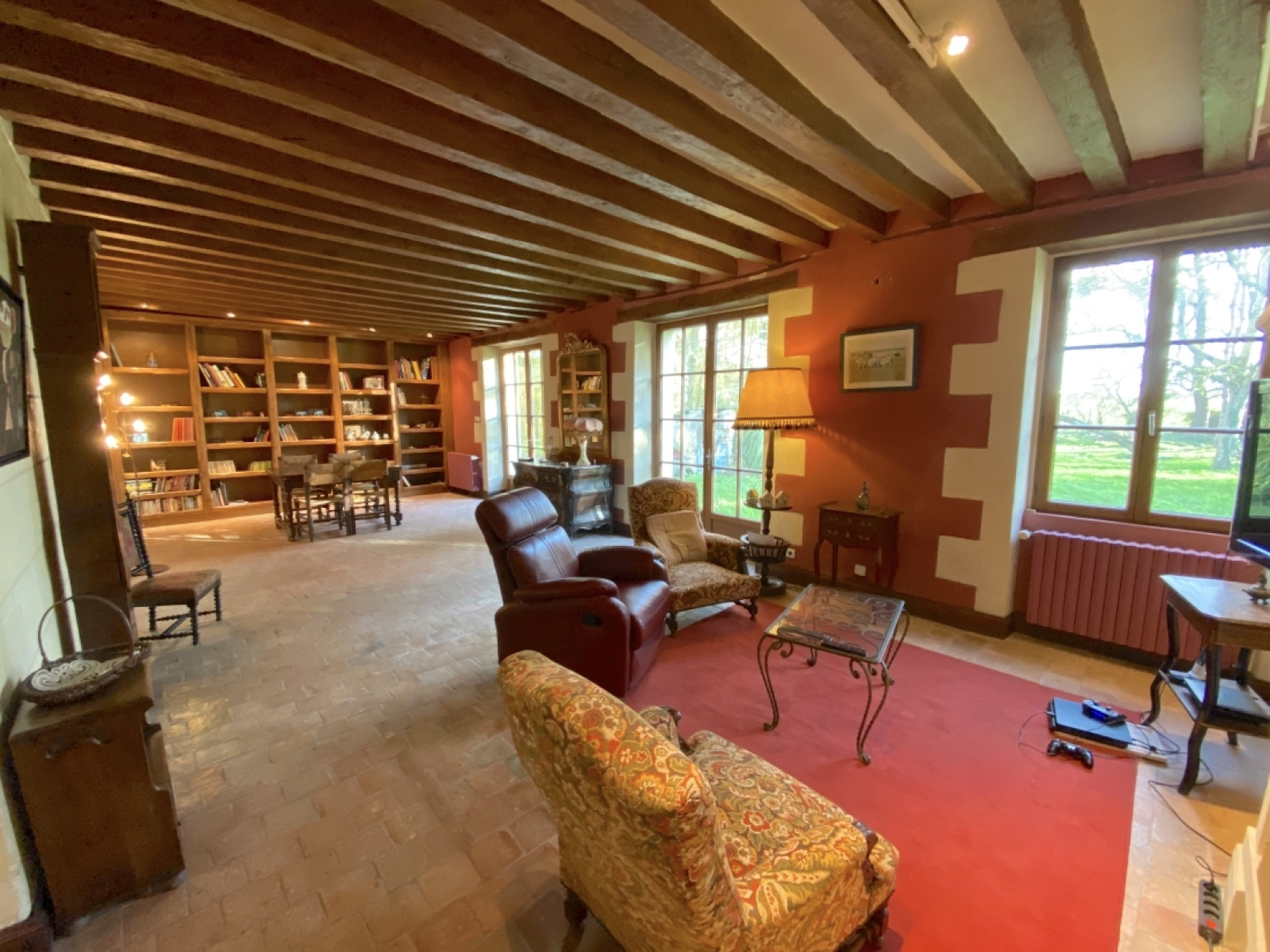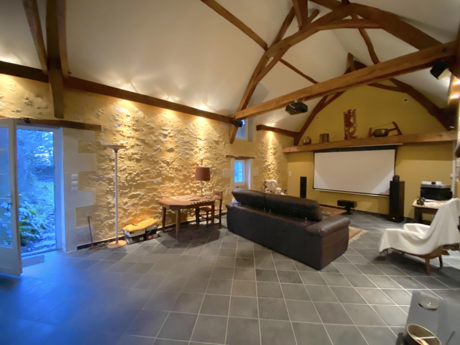 Salle "média" de 40 m2 avec 5 mètres de hauteur sous faîtage, et autre pièce à la suite à usage de sauna et jacuzzi avec douche, et atelier de 5m x 4,70m avec grenier.