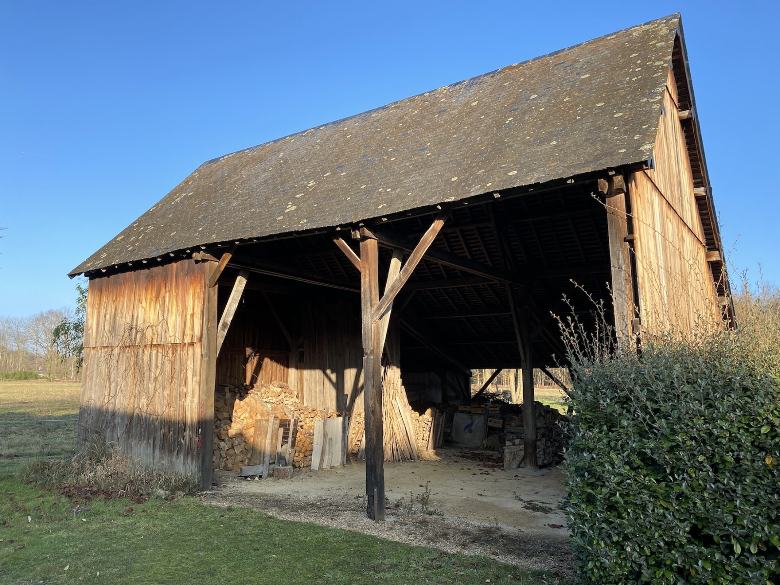 -Grange en bois avec partie bûcher et partie garage (3 voitures)