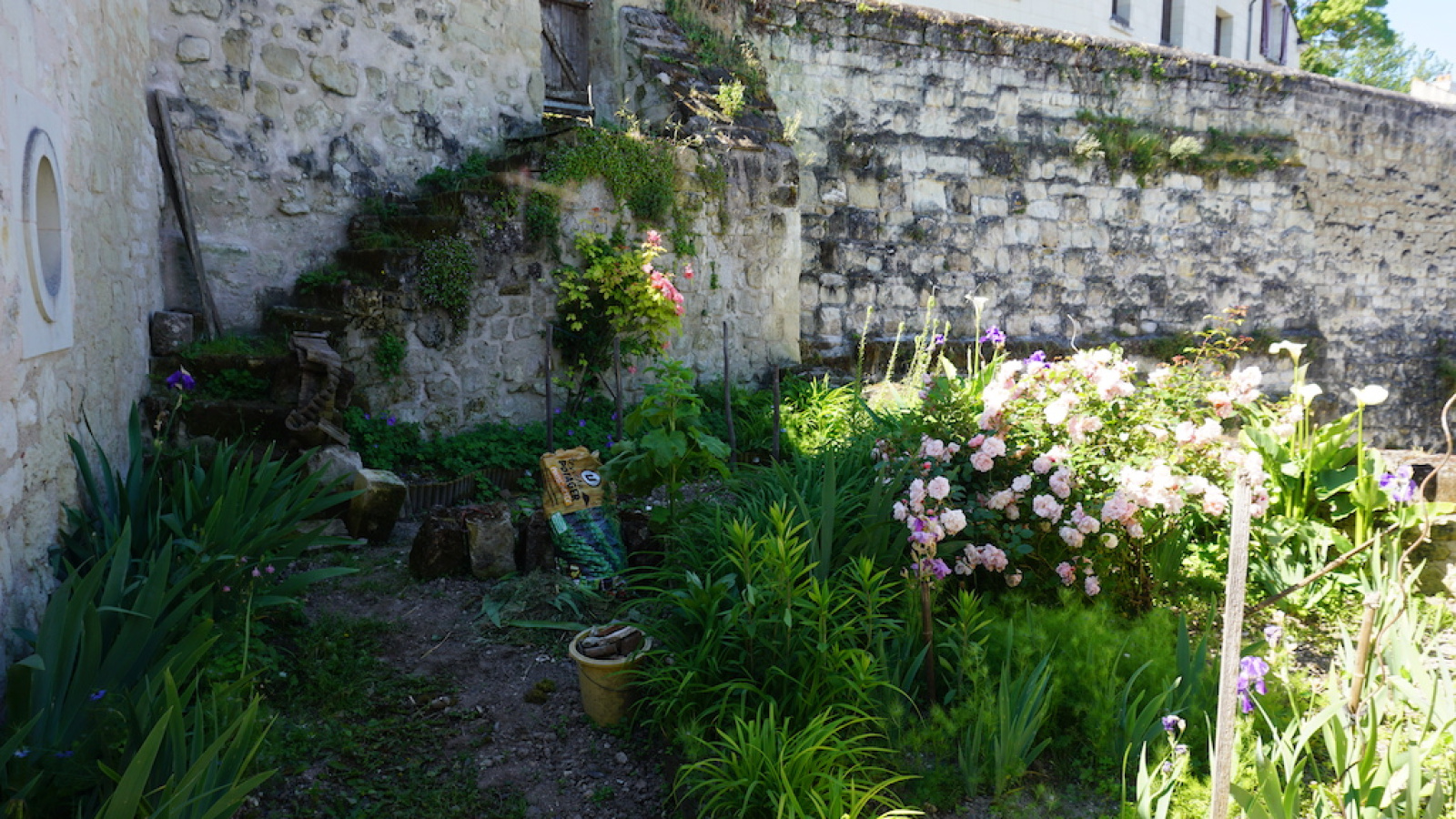 Cour-jardin de plain pied devant la maison avec un accès pour une voiture (environ 100 m2), et petit jardin en terrasse sur l'arrière (au niveau du 2e étage, environ 55 m2) avec une sortie sur une petite rue ; le tout d'une surface cadastrée de 246 m2