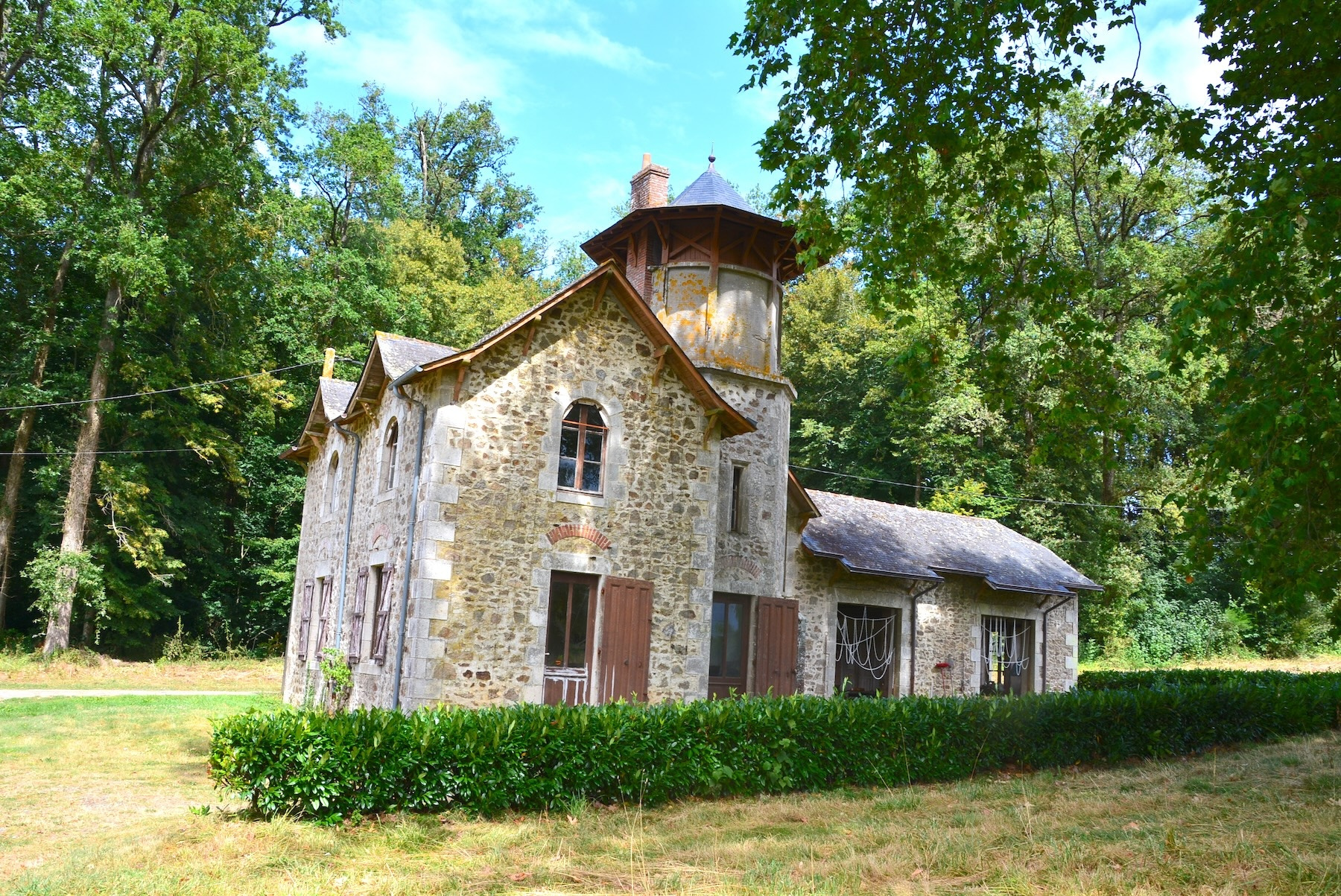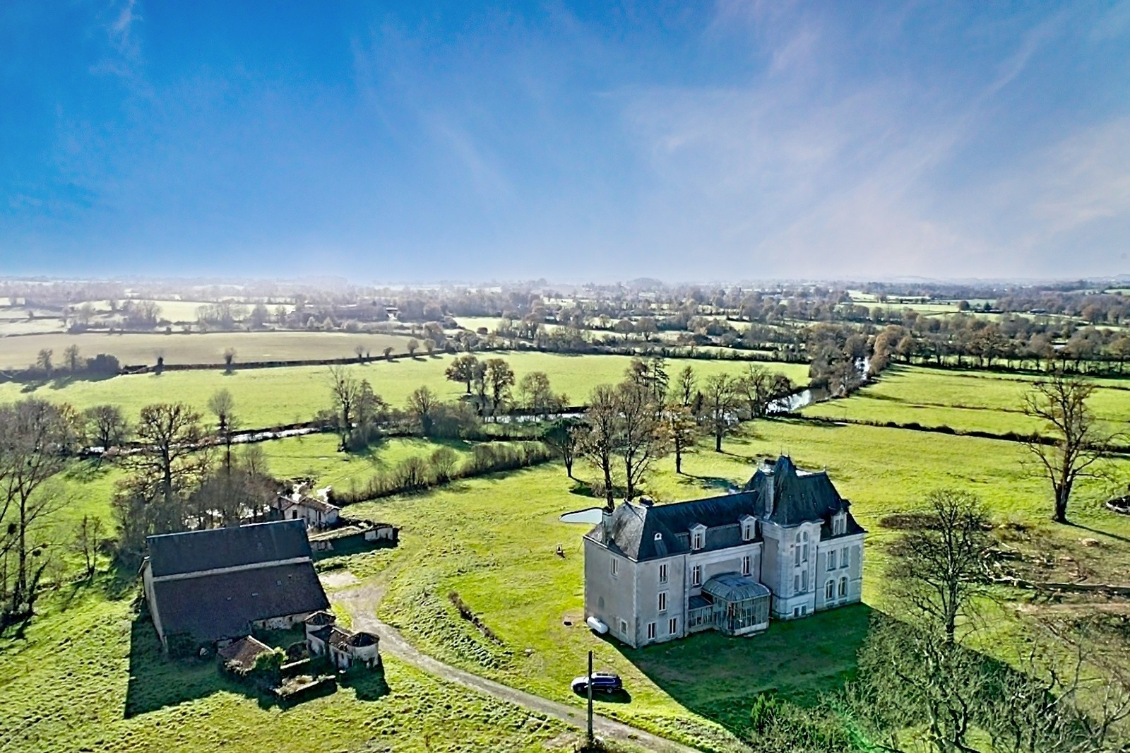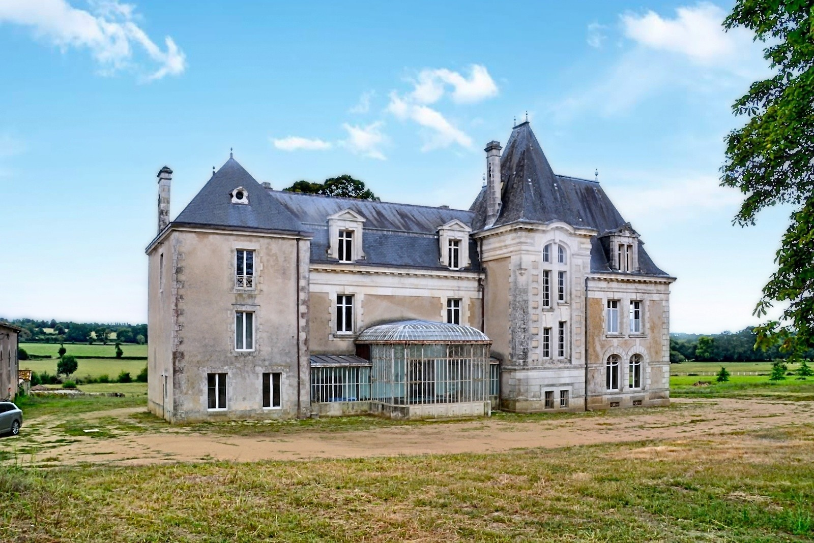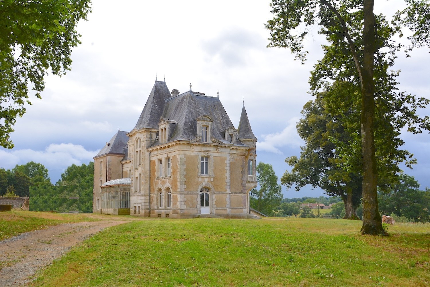 Château XIXe sur 12 hectares entre La Roche-sur-Yon (85) et Bressuire (79) dominant un panorama bocagé au joli relief bordé par la Sèvre Nantaise, petite rivière assurant la limite départementale entre les Deux-Sèvres et la Vendée.