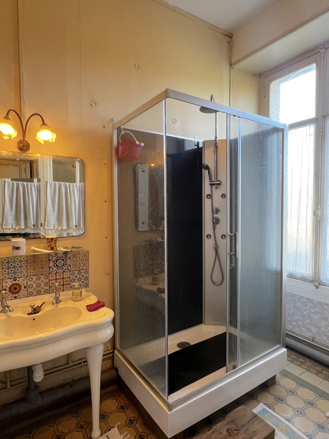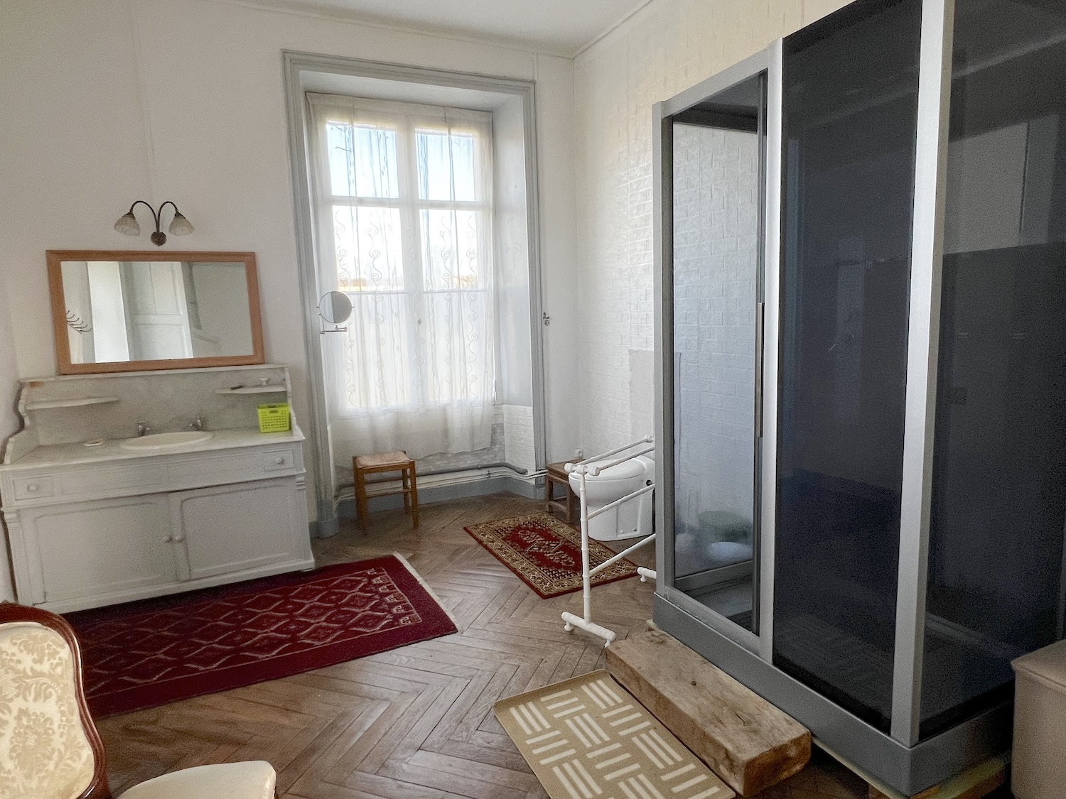 Salle d'eau (douche, baignoire, vasque ancienne et WC)