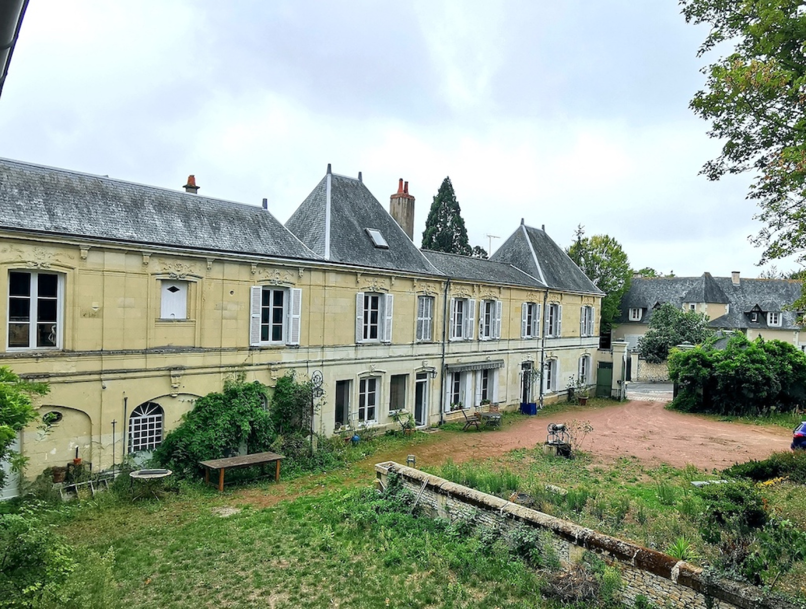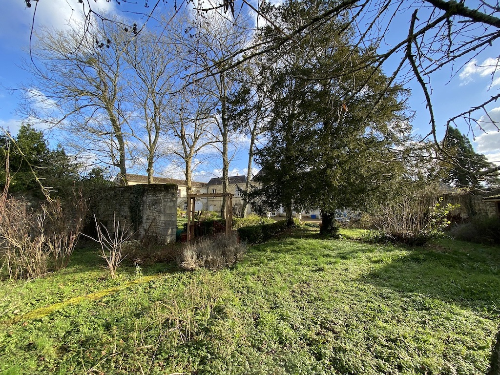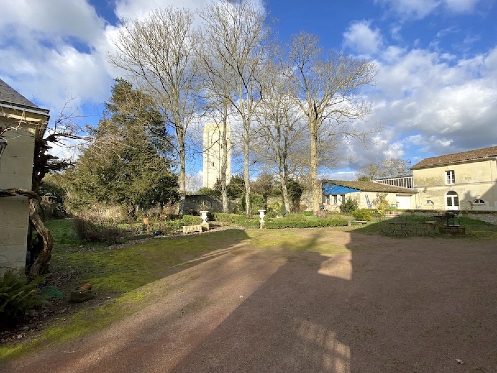 Cour avec platanes et tilleuls, donnant sur une partie jardin dans le fond, l'ensemble clos de murs - Superficie cadastre 1821 m2